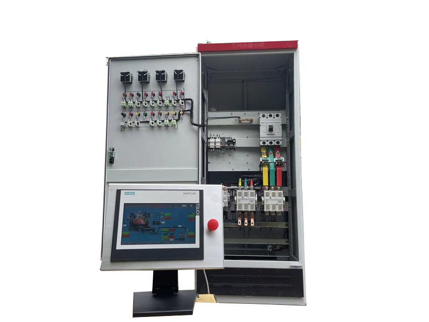 該控制柜采用西門子PLC控制;觸摸屏操作、控制、顯示為一體;具有一鍵啟動,智能化控制,電機的運行適時監(jiān)控,各電機的相關關聯(lián)控制,真正做到了關聯(lián)控制、相互制約,顯示屏具備操作功能;顯示電壓、電機電流,工作狀態(tài)參數(shù)、故障報警、自動停機等功能。